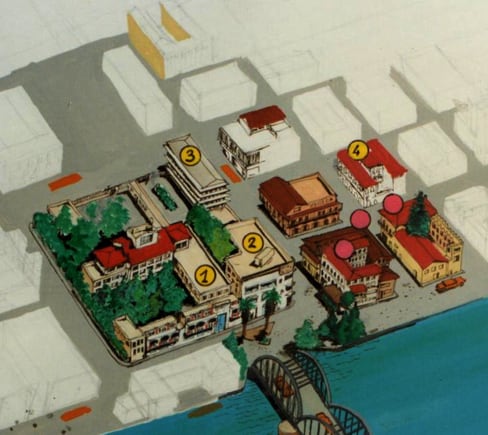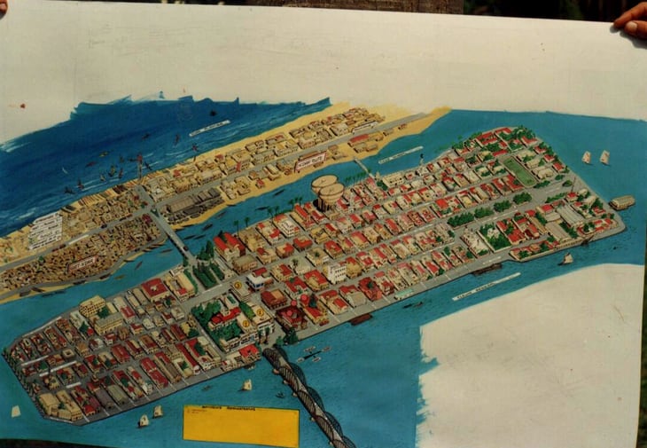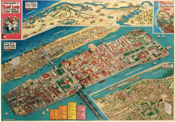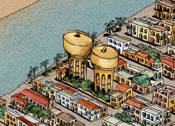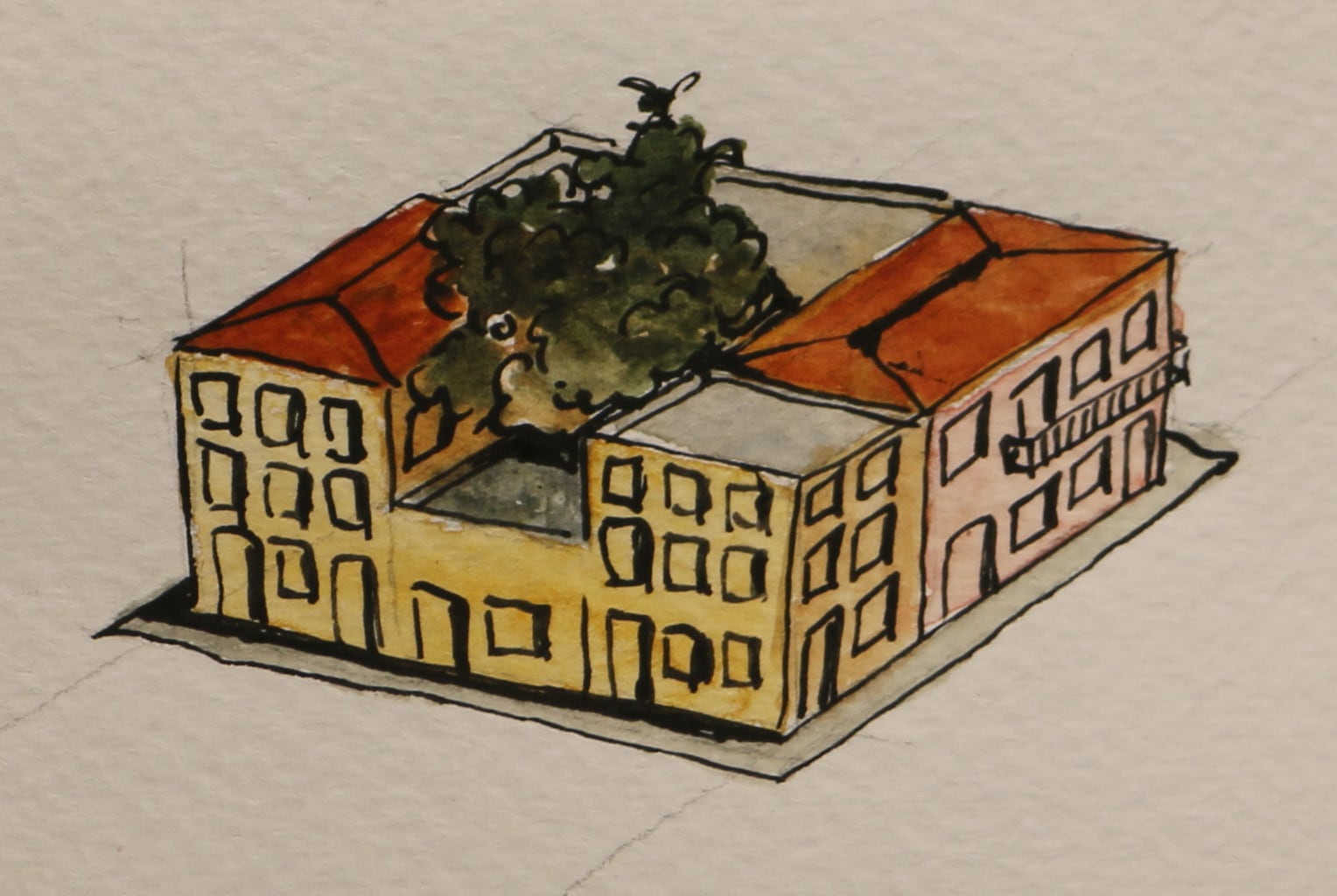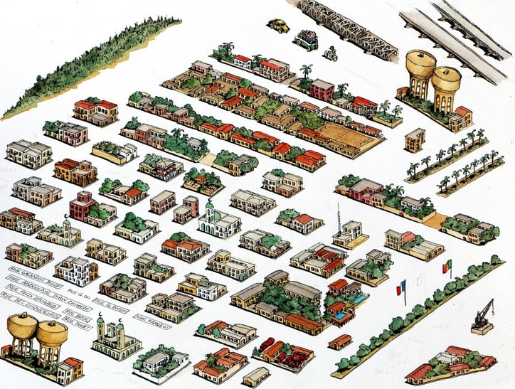 Il y a 168 pâtés de maison sur l'ile, qui ont été représentés sur 5 planches d'aquarelles dont voici un exemple :