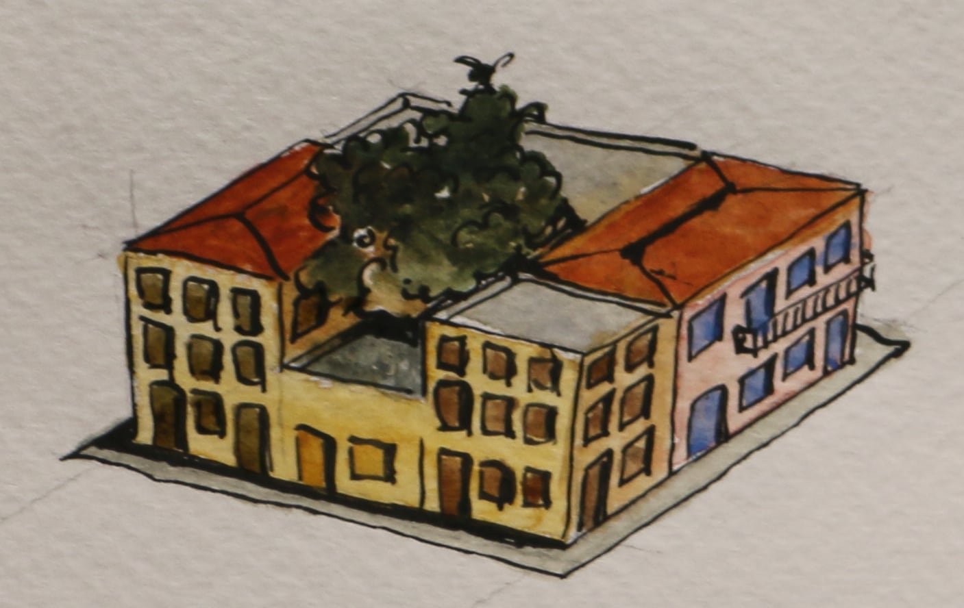 Chaque élément du plan a été réalisé à l'aquarelle et rehaussé de contours à l'encre de chine, photographié, puis, assemblé numériquement avec les autres grâce au logiciel "Pixelmator pro"