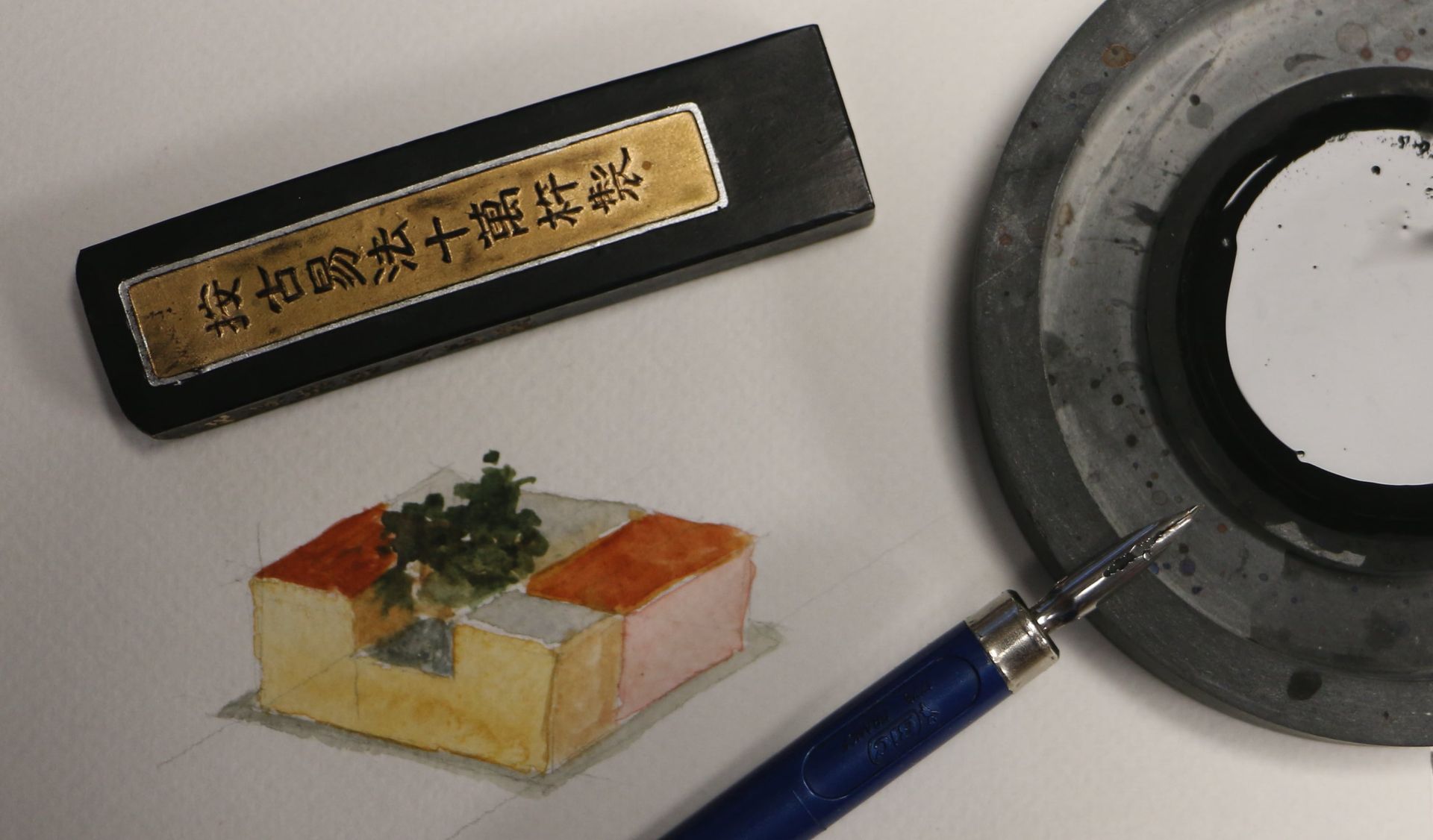 Ensuite la préparation de l'encre, à partir d'un bâton de véritable encre de chine frotté sur une pierre et appliqué à la plume sergent major, ... comme à l'école